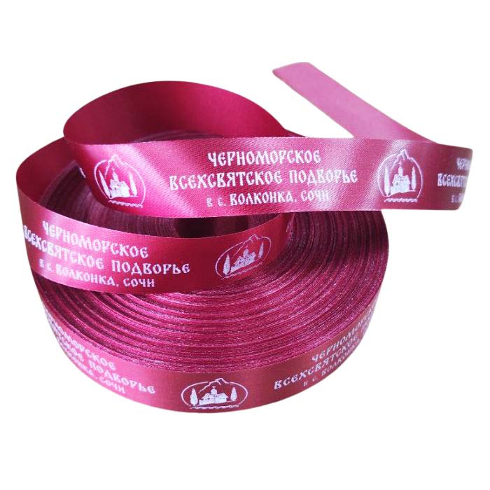 - Шелкография. Белая краска наносится через трафарет, образуя плотный, слегка рельефный слой. Особенно эффективна на тёмных и цветных репсовых лентах, где требуется максимальная укрывистость. В результате получается насыщенный, заметный принт, который хорошо смотрится даже в мелком исполнении. Часто используется для логотипов и фирменных элементов.